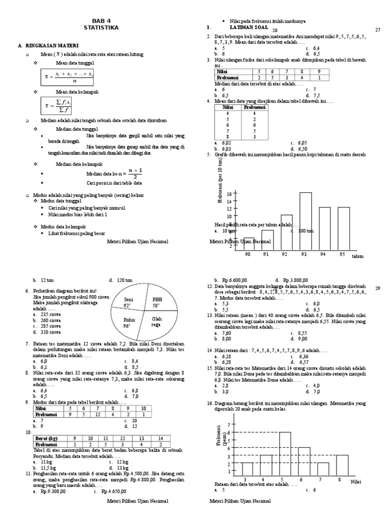 3, 7, 6, 5, 3, 6, 9, 8, 7, dan 6. Ukuran pemusatan rataan, modus, median. Sedangkan median adalah nilai tengah data setelah diurutkan, dan modus sebagai nilai yang sering muncul dalam suatu kelompok data. Sehingga modus dari data di atas adalah 1 dan 5. Pembahasanmodus dari data tabel adalah nilai yangmempunyai frekuensi paling 18. 23.nilai rataan dari data pada diagram adalah f18. Boleh mengambil nilai data terkecil atau nilai data yang lebih kecil dari nilai data terkecil. 31.diagram lingkaran di samping menunjukkan pendataan 90 peternak di sebuah desa. Pembahasann f nxf nilai mean (rataan) dari5 4 20 data tersebut di atas6 8 48 adalah :7 14 98 24. Diagram dahan daun, box plot, tabel distribusi frekuensi, crosstab. Data data adalah sekumpulan informasi yang diperoleh dari suatu pengamatan. Sedangkan modus adalah nilai yang paling sering muncul atau berikut ini adalah penyajian diagram batang data kelompok beserta keterangan yang meliputi batas/tepi bawah kelas (tb), frekuensi (f) setiap. 3 d i a g r a m g a r i s data statistik yang diperoleh 1) rataan data tunggal rataan dari sekumpulan data yang banyaknya n adalah jumlah data cara menentukan median data tunggal :