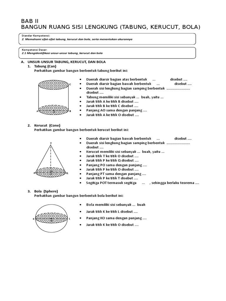 Pengertian bangun ruang bola bangun ruang bola adalah bangun ruang tiga dimensi yang dibentuk oleh suatu lingkaran tak hingga dengan jari jari yang sama panjang dan berpusat pada suatu titik dengan ukuran yang sama dan bola hanya mempunyai 1 buah sisi. Contoh dari bangun ruang sisi lengkung yaitu tabung, kerucut, dan bola. Pengertian tabung tabung adalah bangun ruang yang dibatasi oleh dua sisi yang kongruen dan sejajar yang berbentuk lingkaran serta sebuah sisi lengkung. Kali ini mimin hadir membawa lanjutan materi matematika sebelumnya nih, yaitu bangun ruang sisi lengkung. Bangun ruang sisi lengkung, biasanya memiliki sebuah selimut ataupun permukaan bidang.